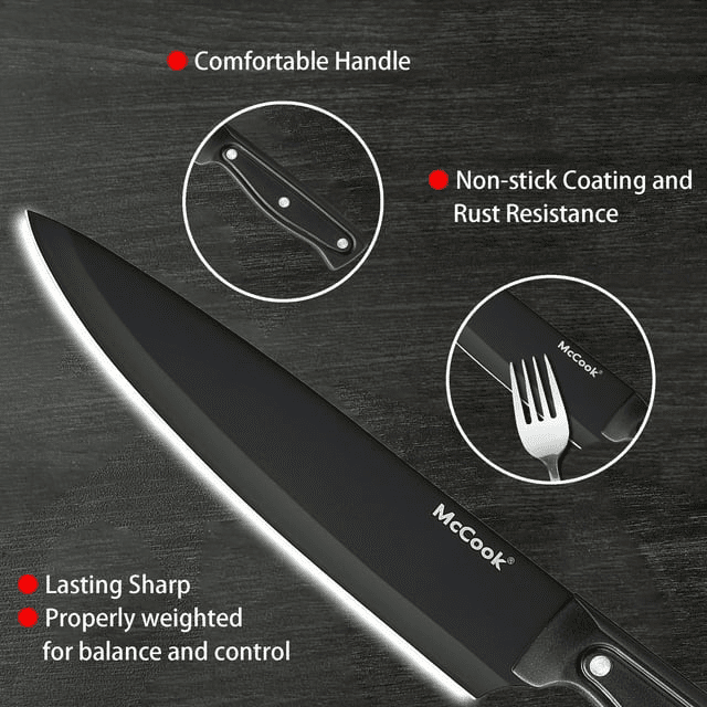 Made of high-carbon one-piece stainless steel with super black coated all over, the mccook 26-piece black knives sets are dishwasher safe, non-stick and rust-resistant.
